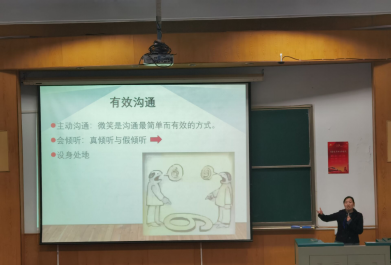 大学生心理科学与健康研究中心王煜老师发表大学生心理健康教育讲座,她从“为何需要沟通”“何为沟通”“可能遭遇的沟通困难”“如何沟通”等四个方面对同学们的心理健康情况做出指导。还提出“有效沟通”的概念,即主动沟通、会倾听、设身处地的为他人着想。
