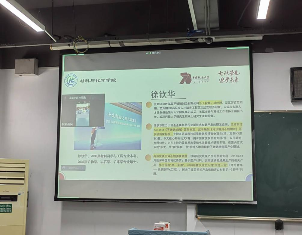 2000届优秀校友,江阴法尔胜泓昇不锈钢制品有限公司总工程师、总经理,武汉科技大学研究生学院硕士研究生兼职导师徐钦华先生为同学们做分享。