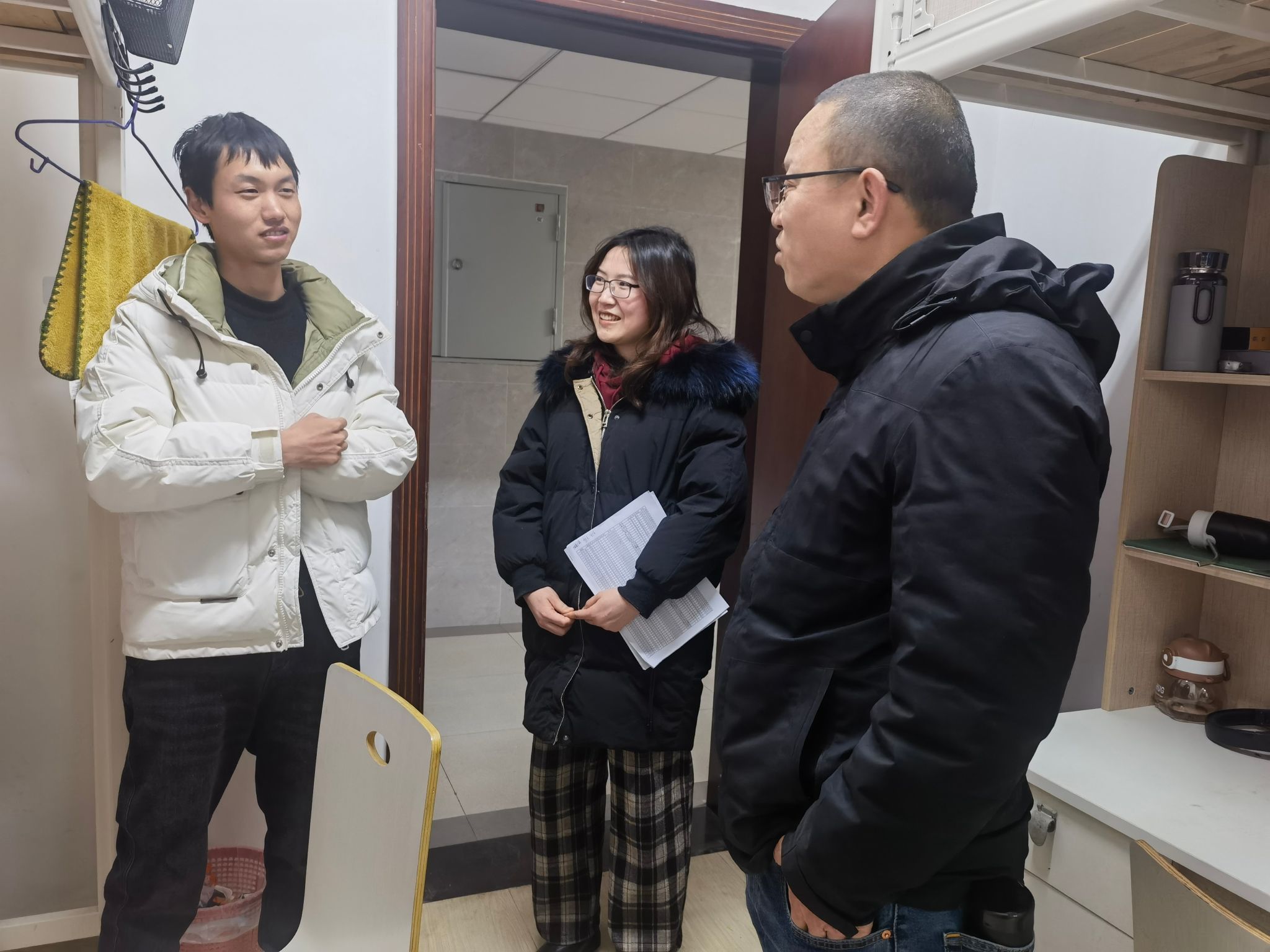 走访过程中,学院领导与学生亲切交流,了解返校情况、假期思想状况、学习生活、考研就业等情况,详细问询学生是否家庭受恶劣天气影响造成经济人身安全损失,提醒学生注意交通安全、实验室安全、宿舍用水用电安全,谨防电信诈骗和接触式诈骗等,勉励学生做好新学期规划,以良好的状态迎接新学期。