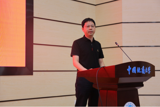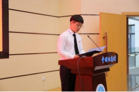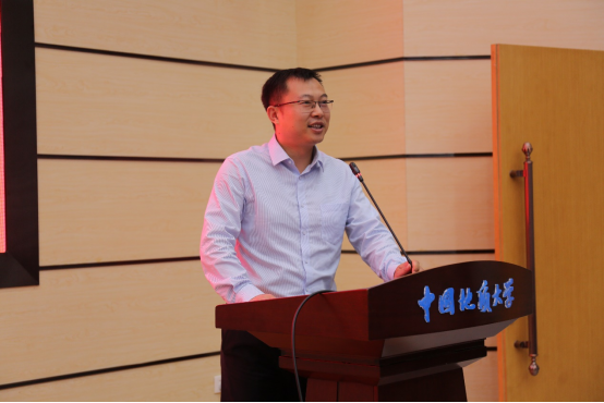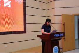 高年级研究生代表、2021级硕士研究生马瑞奇同学发言。他结合自己的求学经历,以“目标、坚持、品性、情义”四个主题与大家共勉,希望和大家一起在实践中砥砺品格、强化本领,努力成为可堪大用、能负重任的地大材化青年。