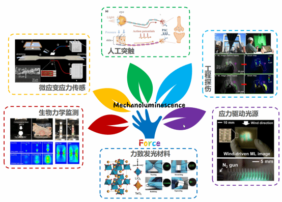 5. 应力发光材料的设计及应用研究,在智能传感、电子签名与防伪、生物医学、信息存储、结构探伤、可穿戴设备和电子皮肤等领域具有广阔应用前景。