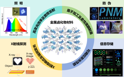 2. 金属卤化物发光材料合成及其光电应用。金属卤化物具有晶体结构和电子结构可调、易于溶液加工、成本低等优点,其光电性能优异且适用于大规模生产和应用。一方面,金属卤化物发光材料具有高效率宽带发光特性,在照明、X射线探测等领域具有较大应用潜力。另一方面,由于金属卤化物材料软晶格特性,材料对水、热、光照、溶剂分子等十分敏感,易实现发光颜色可控调整,根据这一特性,可以制备成柔性薄膜等,实现在传感、防伪、智能响应、信息存储等领域的应用。