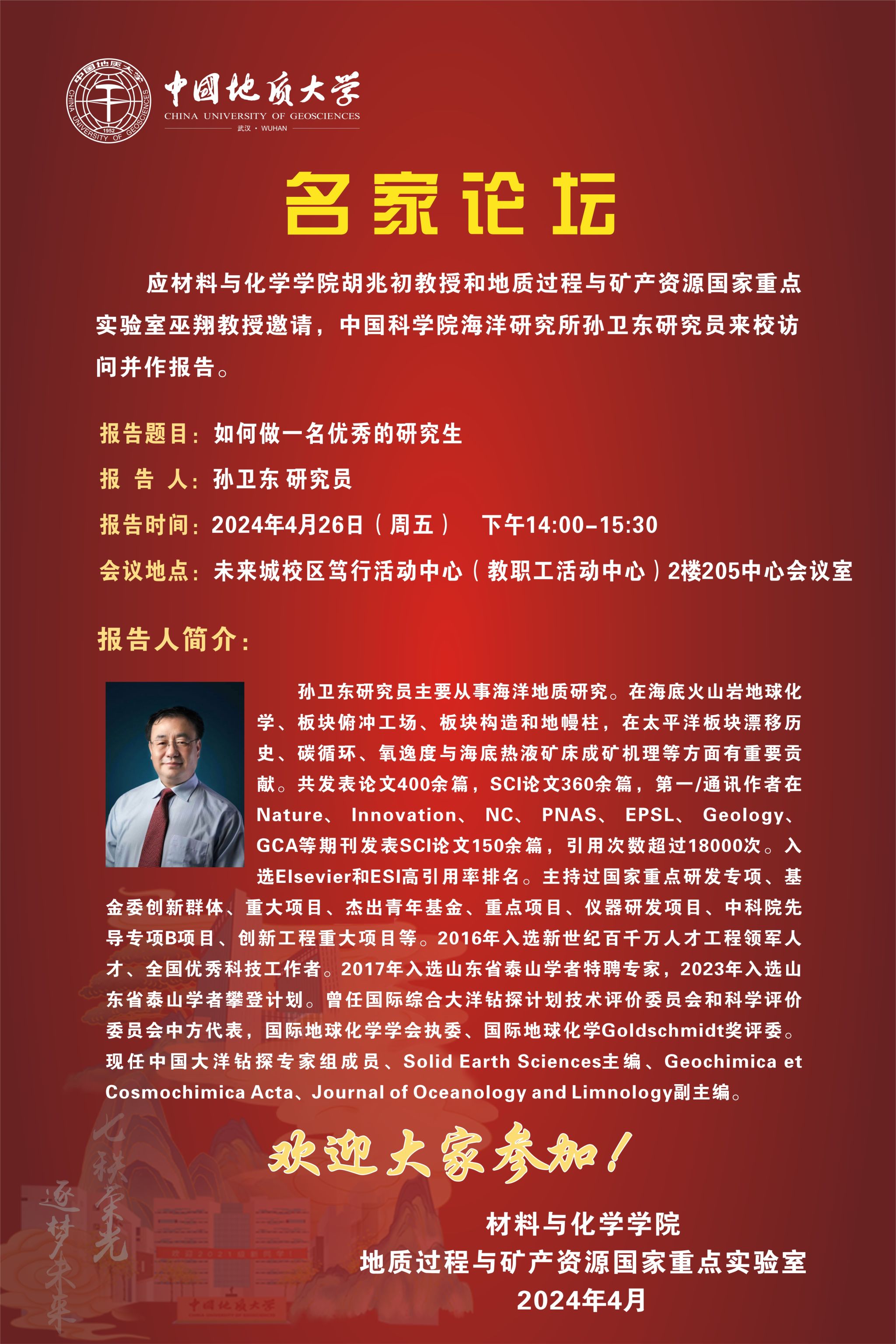 应午夜AV 及地质过程与矿产资源国家重点实验室邀请,国家自然科学二等奖、安徽省科学技术一等奖获得者,中科院海洋研究所孙卫东研究员将与午夜AV 师生交流并讲座。