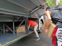 搬迁当天,从清晨开始,同学们就陆陆续续地将行李往宿舍楼下搬,大家互相帮忙,等待大巴车的到来。学院领导老师、各班班主任一大早就赶赴现场,他们亲自上阵,帮助同学们一起搬运行李。本科生院苏洪涛老师、李纪亮老师到现场进行总体把控,有序调度。在高效有序的组织下,全体人员一起为这次搬迁工作贡献自己的力量,数不尽的纸箱和编织袋有条不紊的被搬上大巴车。而在这个过程中,天空下起了淅淅沥沥的雨,减缓了大家前进的速度,但无法阻挡全体人员的前进步伐。