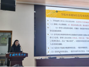 她同时表示,从本学期起,学院将进一步强化全体教师学习制度,每月将在学院、各系、各党支部、各教学团队等四个层面分别组织集中学习,进一步加强师德师风建设,切实做到立德树人。