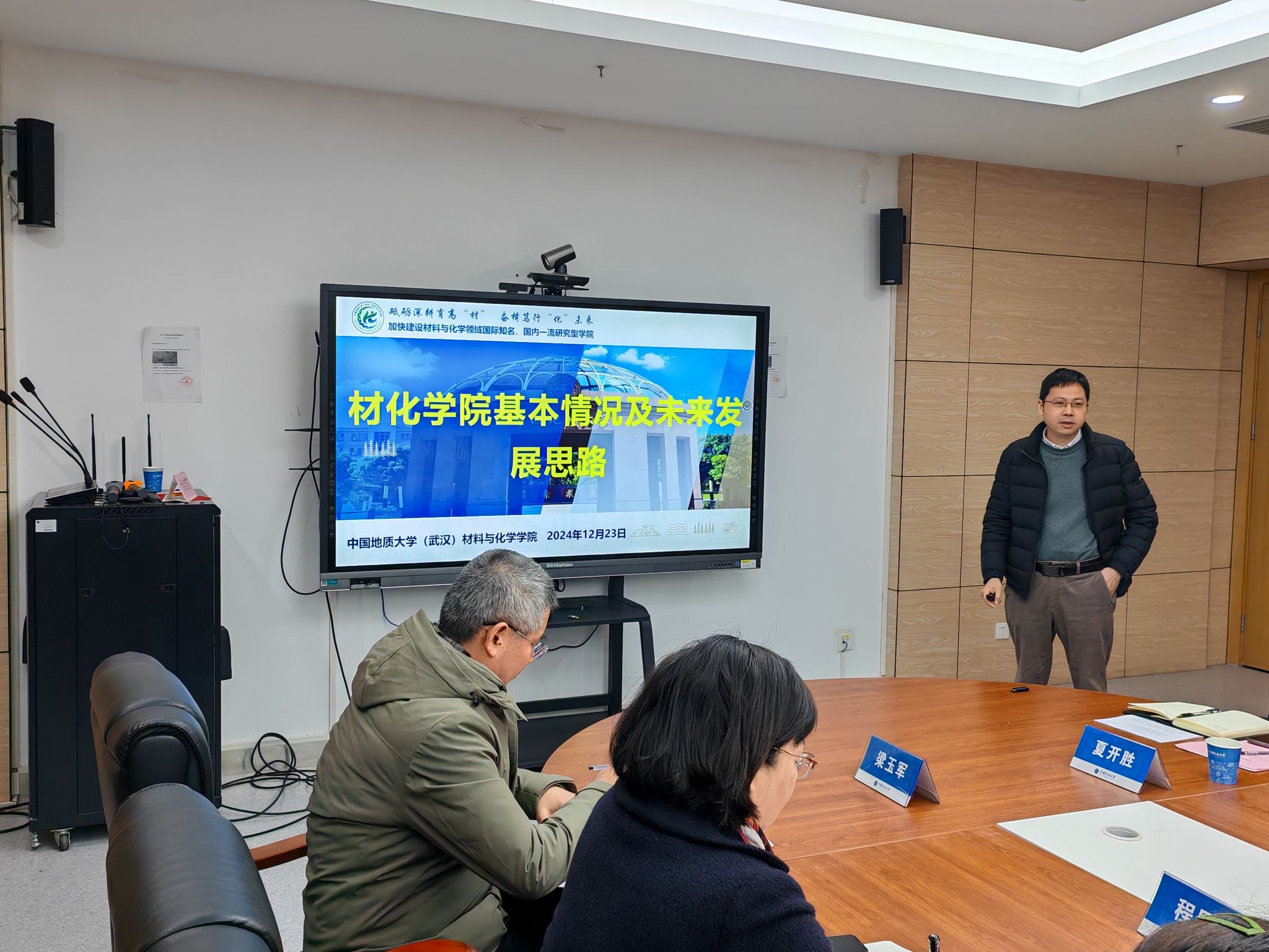 院长胡兆初汇报学院整体工作。他分别介绍了学院基本情况、2024重要工作进展及成绩、战略目标与发展定位、未来发展思路。他指出,在学校领导及各职能部门的关心支持下,2024年学院在人才培养、科学研究、师资队伍建设、学科建设及对外合作等多个方面取得可喜成绩。他表示,学院将继续紧扣“四个面向”与国家战略需求,持续深化产教融合联盟内涵建设,加大有组织推进校企科技合作与人才联合培养力度,全面提升大仪平台对外服务能力,全力筹备做好材料与化工专业博士授权点申报,为学院高质量发展奠定坚实基础。