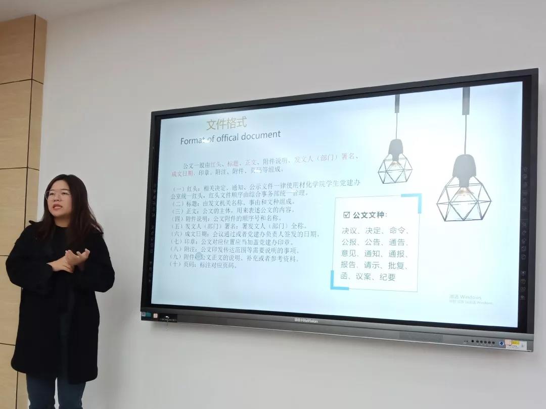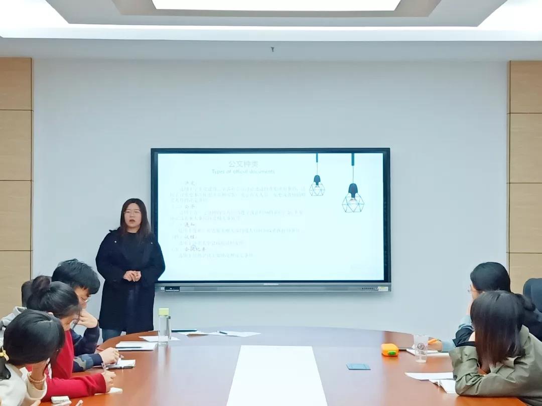 在党建办骨干培训课程第三讲中,魏梦贞以“公文写作”为主题,向党建办成员们讲述了公文的组成部分以及各组成部分的格式要求。