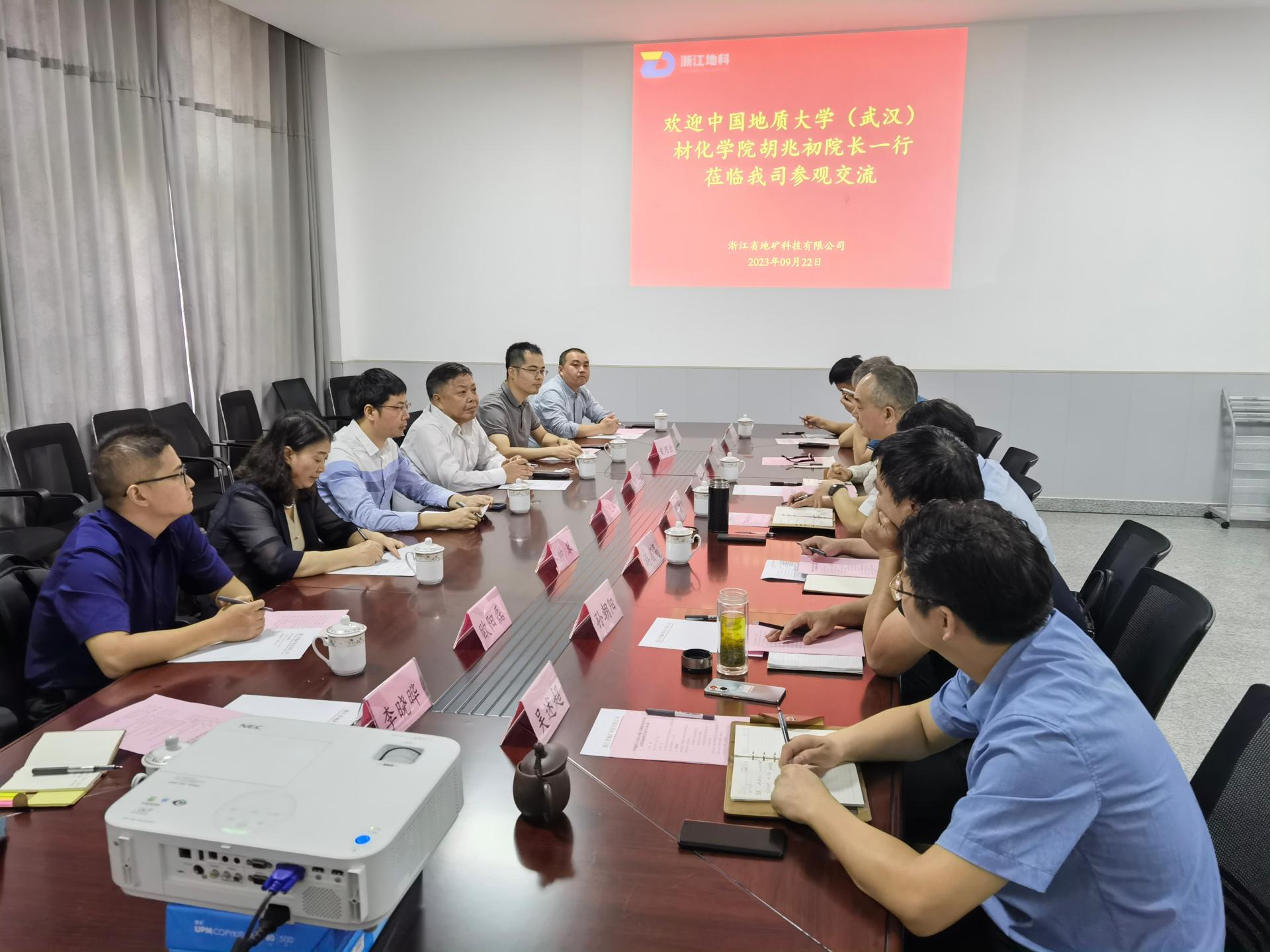 在浙江地科公司,浙江地科党委书记、董事长袁波对胡兆初院长一行表示热烈欢迎,他指出,浙江地科公司由浙江省地质矿产研究所、浙江省第十一地质大队两家事业单位所属企业整合而组建,是一家集科学研究、技术服务、生产经营于一体的综合性新型科技企业。他希望充分发挥材化学院人才和科研方面的优势,围绕公司人才队伍培养、实验检验检测、矿物新材料等方面的需求,加强人才队伍建设和产学研合作,积极推进重大项目谋划合作,促进科研成果转化。